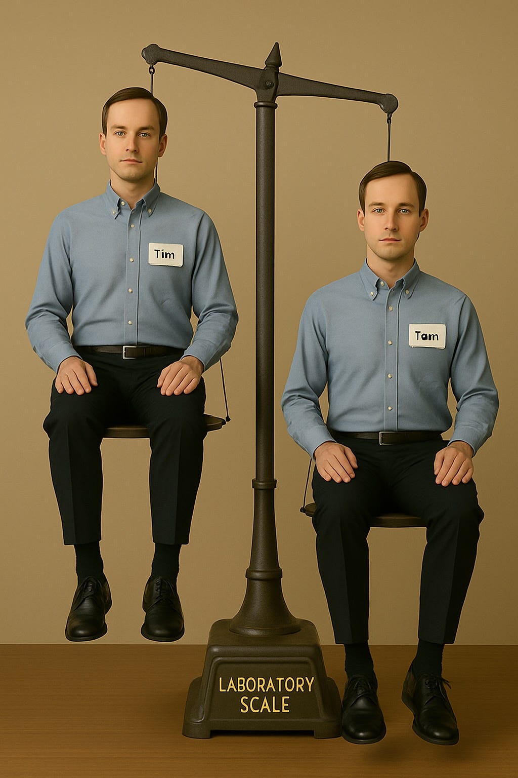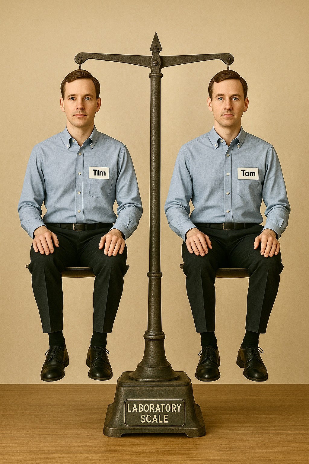First, the scientists place Tim and Tom on a laboratory scale to confirm that they are exactly the same weight: