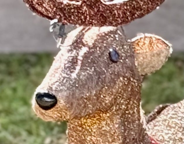 Evidently what went down here was that Santa Claus, who can be seen crumpled up in the deflated inflatable chimney at right, was stabbed by the Grinch (face down, center) who in turn was antlered to death by the reindeer, who is thinking — you can see it in his eyes…