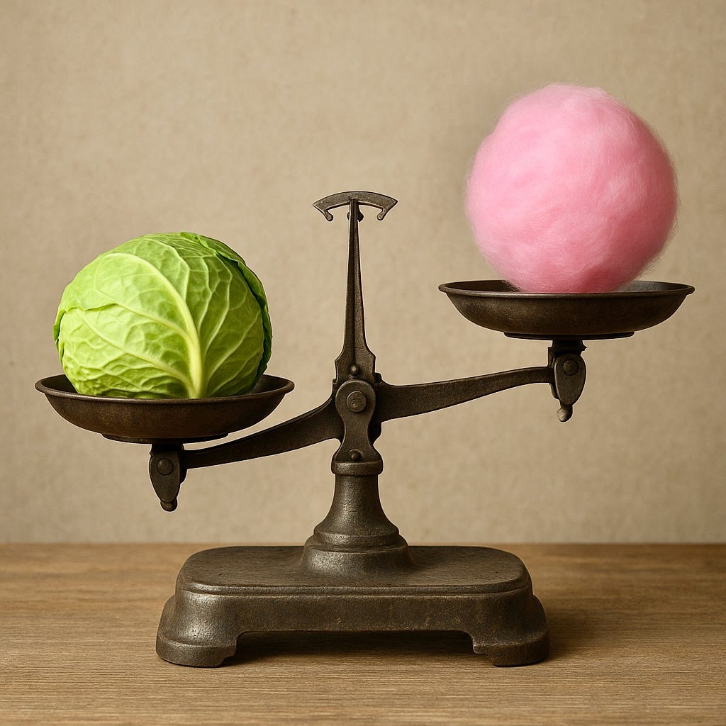 Next, the scientists have Tim eat the head of cabbage, and Tom eat the cotton candy. Here’s where it gets interesting. You would think that, since the cabbage is heavier than the cotton candy, Tim would now weigh more. But surprisingly, when the scientists weigh the twins again, they discover that...