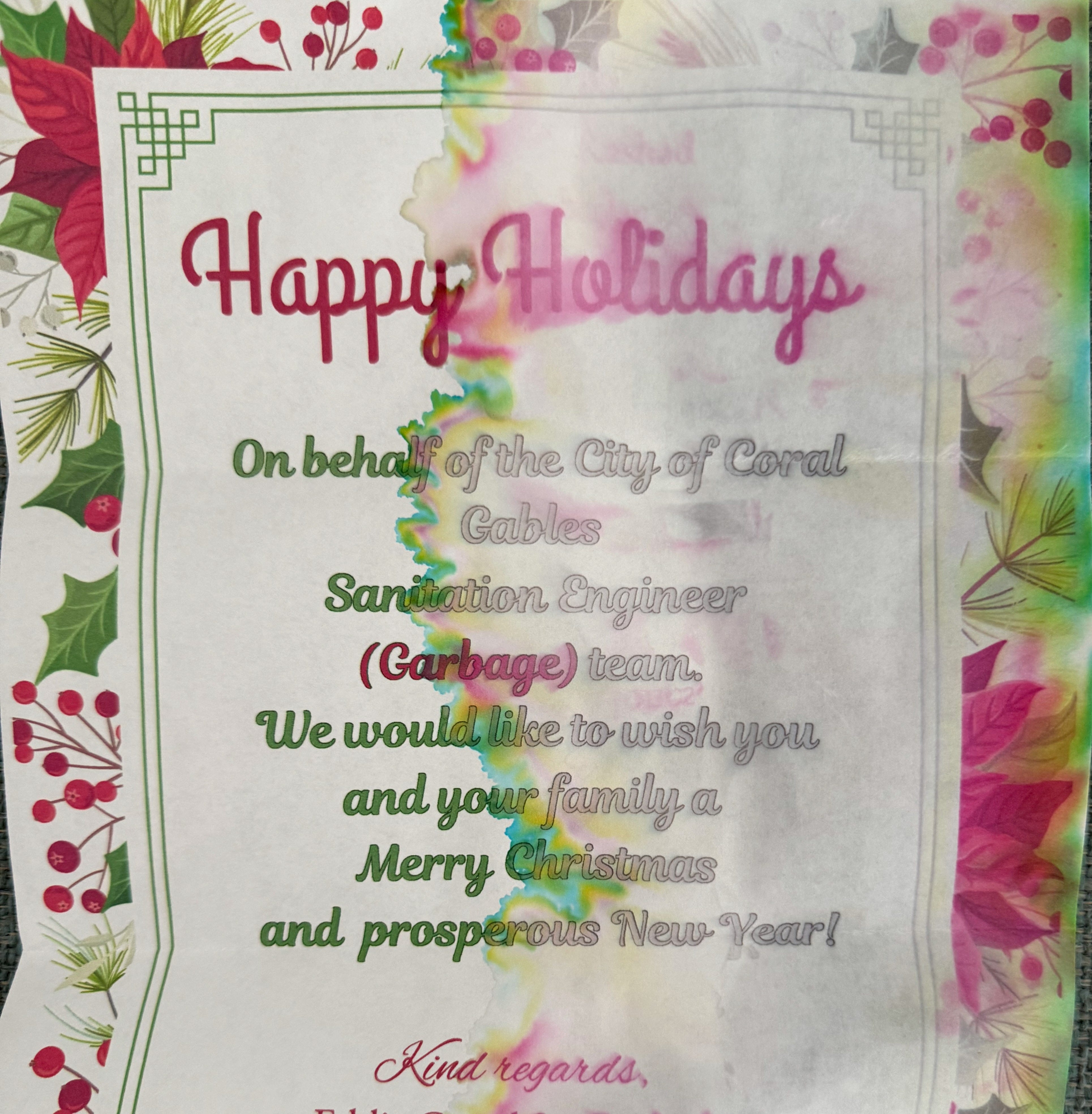 But enough about eating. The holiday season isn’t just about food: It’s also about people, especially the people who reach out to us at this special time of year to let us know they’re thinking about us. For example, here’s a holiday note our household just received from our Sanitation Engineer team: