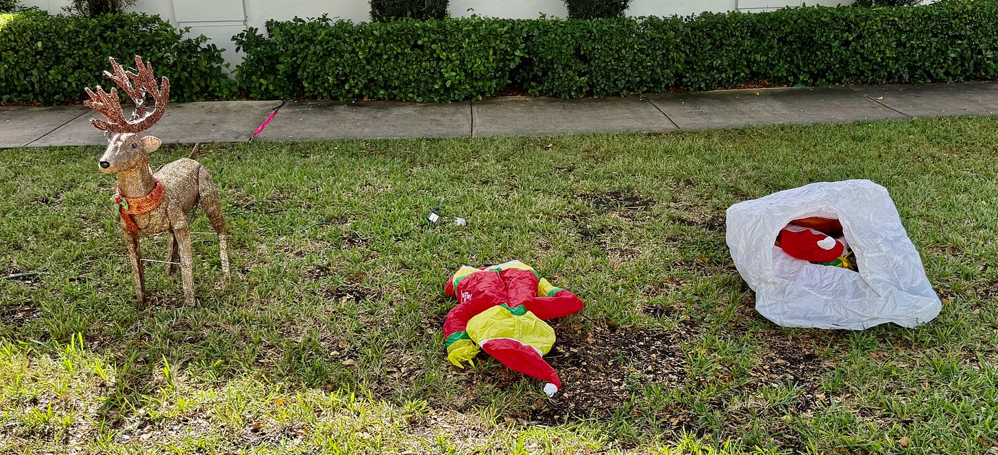 Here in South Florida Christmas is in the air, with temperatures sometimes dipping below 80, which means homeowners can safely emerge from their homes long enough to set up festive yard displays. Currently the best display in my neighborhood depicts what appears to be a festive Yuletide crime scene: