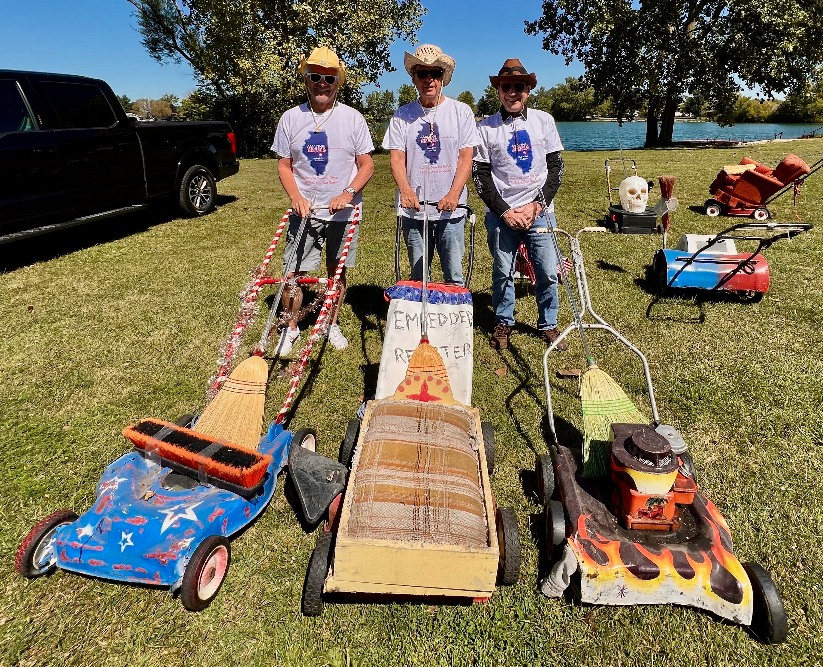 For example, two of my closest friends are Rob Stavis and Ron Ungerman. Do we talk every day, or even every month? No. When we do talk, do we share our innermost feelings, which as I have noted we do not actually have? Again, no. But what we DO do, every couple of years or so, is travel to Arcola, Ill., for the annual Broom Corn Festival parade, in which we participate as proud members of the World Famous Lawn Rangers, a precision lawnmower-and-broom marching unit. Here's a photo of us posing with our customized show mowers before last year's parade.