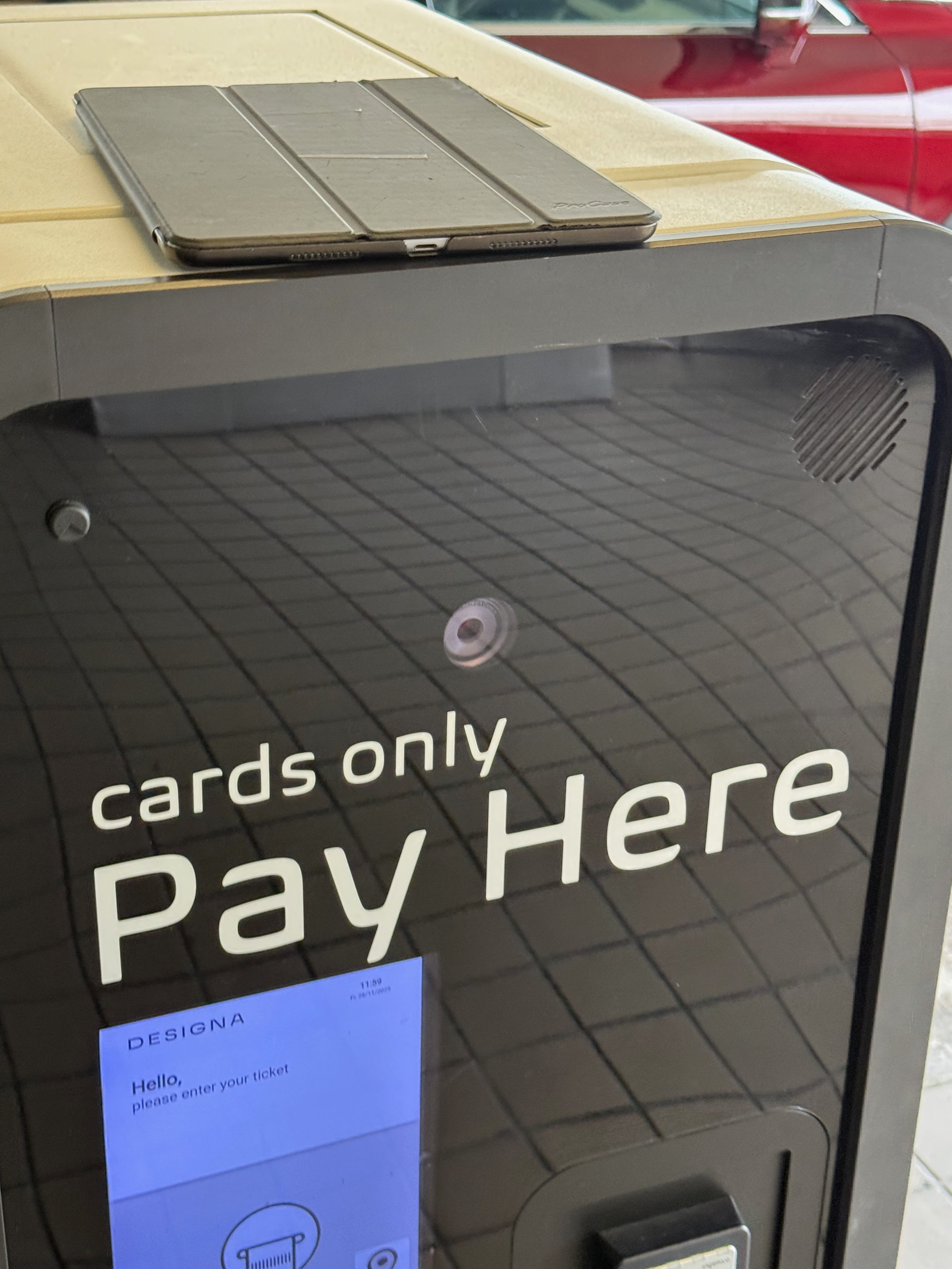 Anyway, to free my hands I set my iPad on top of the parking machine, as illustrated by this dramatic re-enactment photo: