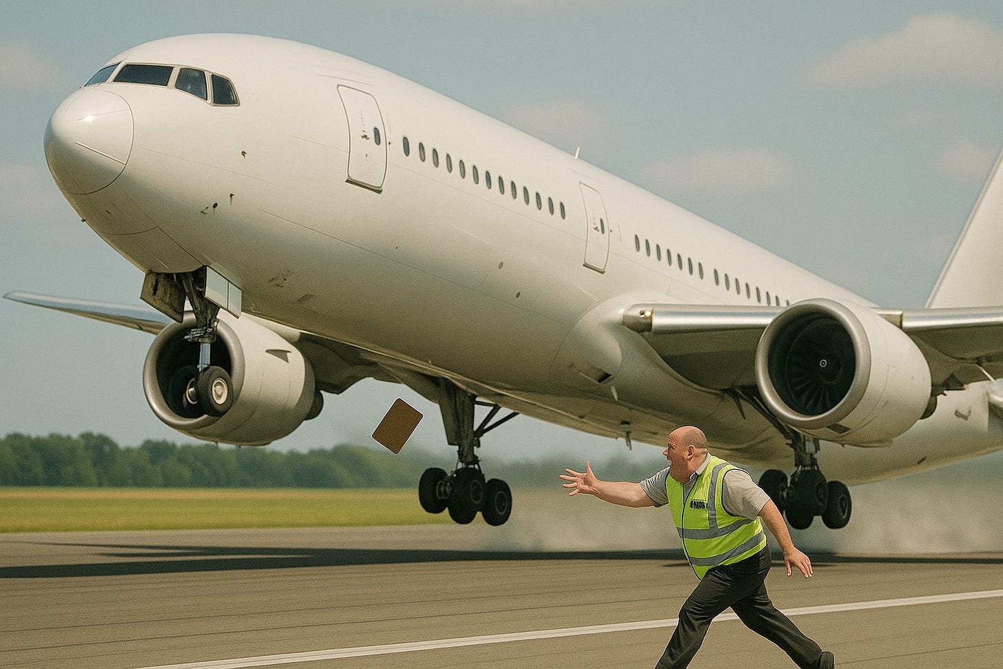 I want to start by apologizing to the commercial aviation industry. In my previous Substack I was harshly critical of the airlines, but my flight to New York last Friday departed right on time, despite a last-second effort by Wayne from the Takeoff Prevention Unit (TPU), who can be seen in the photograph below sprinting down the Miami airport runway trying to stop my plane so he can replace the auxiliary catheterization sequencer.