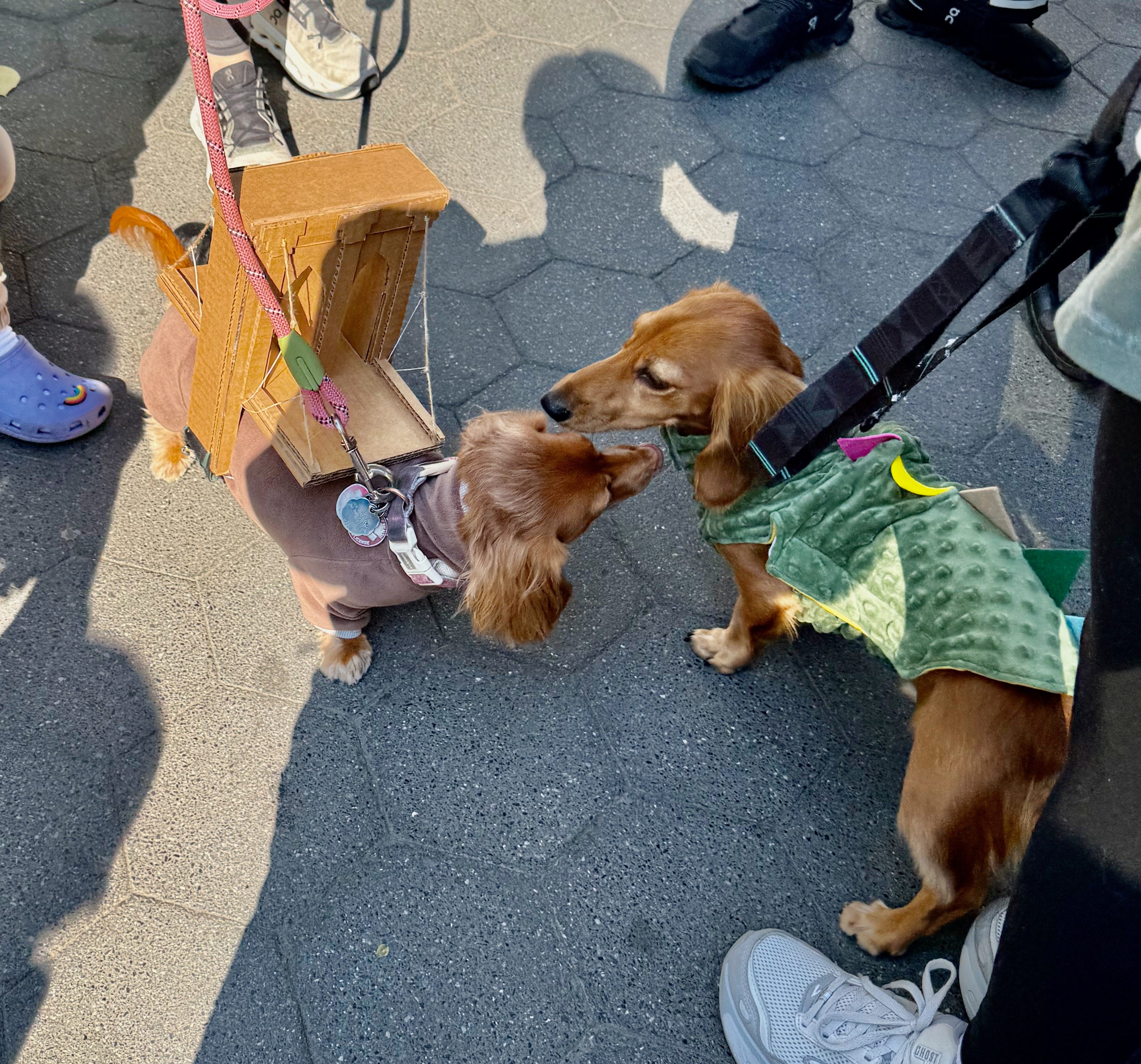 Here’s a wiener dog dressed as the Brooklyn Bridge meeting a wiener dragon.
