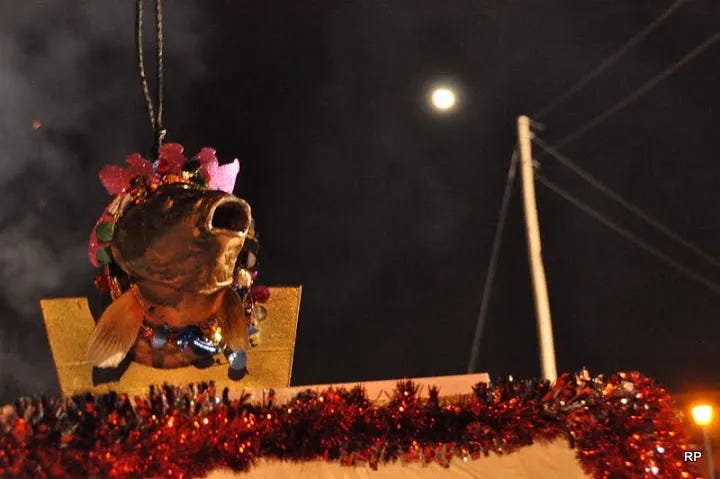 It’s different story in the Wisconsin city of Prairie du Chien, which is French for “Prairie of the Chien.” On New Year’s Eve, as part of Carp Fest (”Fest du Carp”) they lower a frozen and tastefully decorated carp, which was previously caught (Don’t tell PETA!) in the Mississippi River. They use a different carp every year, but they always name it Lucky.