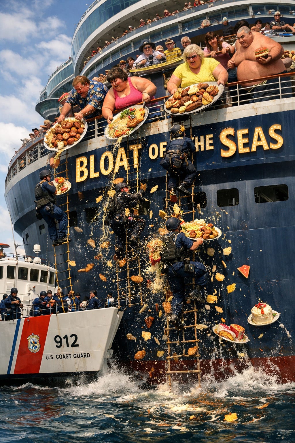 Meanwhile in the Caribbean, tensions continue to mount as a U.S. Coast Guard cutter attempts to seize a 250,000-ton cruise ship, the Bloat of the Seas, which Pete Hegseth says is believed to be carrying “a substantial number of suspected Venezuelan cigars.” The mission has to be aborted when the Coast Guard boarding party, attempting to ascend the side of the ship, is driven back by a torrent of buffet selections rained down on them by cruise passengers wielding dinner plates the size of manhole covers.
