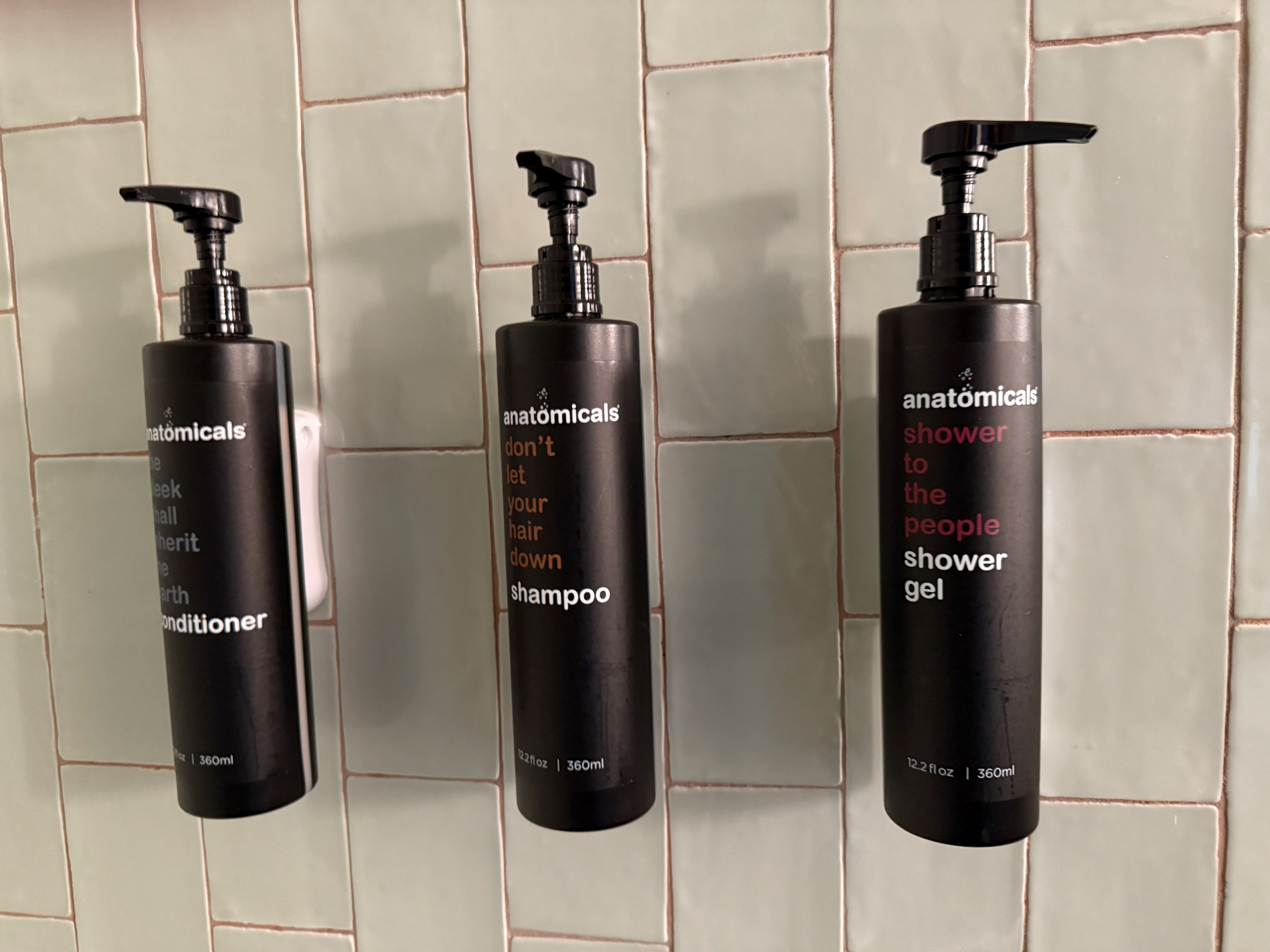 OK, one more book-tour-related matter before we get to today's important Substack topic. If you've stayed in hotels recently, you've probably noticed that hotel showers these days all have three bath-product dispensers mounted on the wall. The products are always conditioner, shampoo and shower gel, but their order on the wall varies from hotel to hotel. Sometimes it's shower gel, conditioner, shampoo: