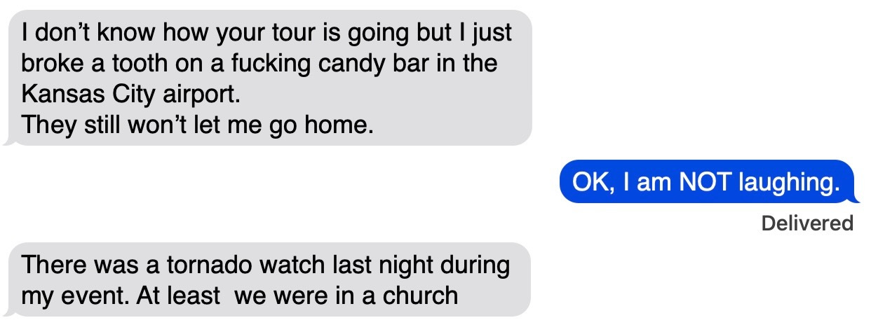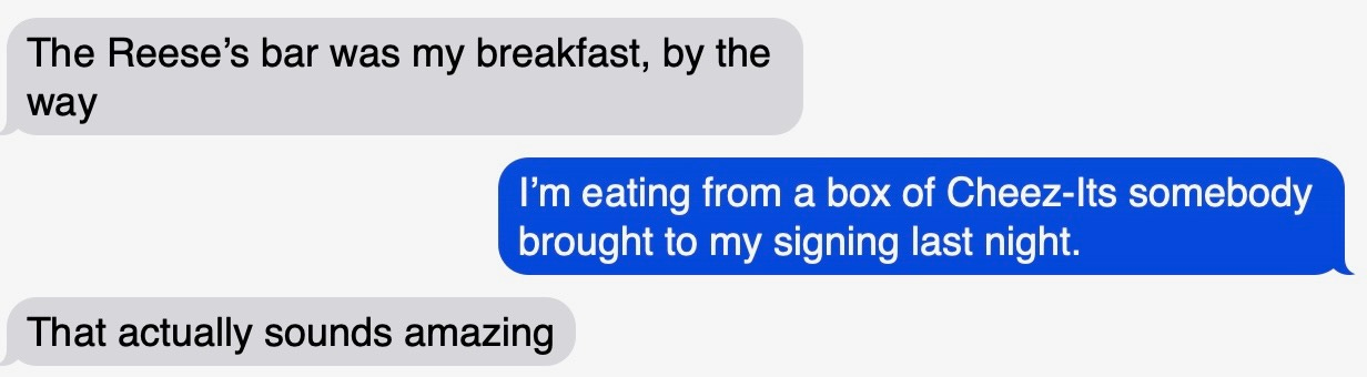 Carl further texted me that the specific type candy he broke his tooth on was a Reese's bar; he said he was going to try to get the tooth repaired in St. Louis. Then we had a brief discussion about our book-tour nutrition regimens: