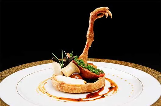 This dish makes an artistic culinary statement, specifically: “The pigeon is dead, but it is nevertheless reaching up from the grave in an effort to poke out your eyeball.” As the French say: “Yumme!”